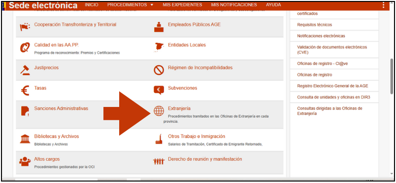 - Vai alla sezione Procedimientos (nella parte centrale della pagina) e seleziona “Extranjería”